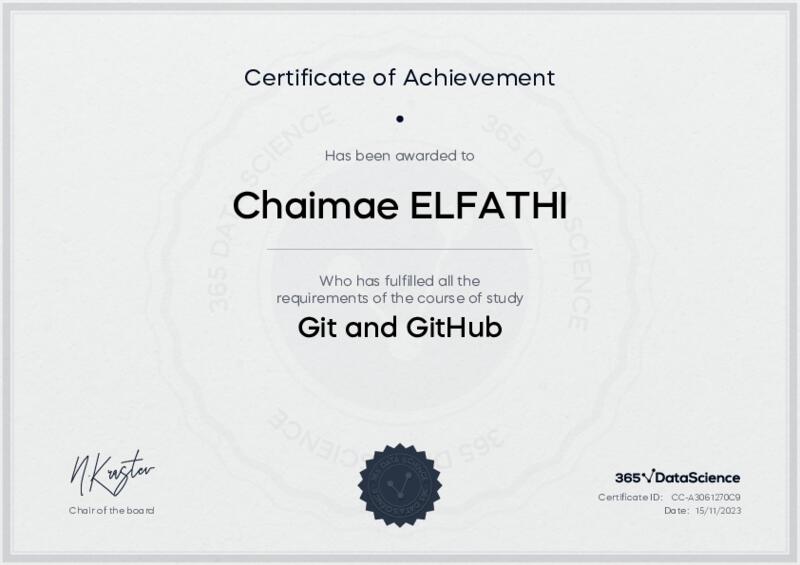 This user has been awarded the Git and GitHub Certificate for successfully completing the course exam. Holding this certificate demonstrates their proficiency on the topic and signifies they are qualified to apply their newly acquired expertise in the fields of data analytics and data science.
