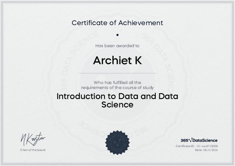 This user has been awarded the Introduction to Data and Data Science Certificate for successfully completing the course exam. Holding this certificate demonstrates their proficiency on the topic and signifies they are qualified to apply their newly acquired expertise in the fields of data analytics and data science.