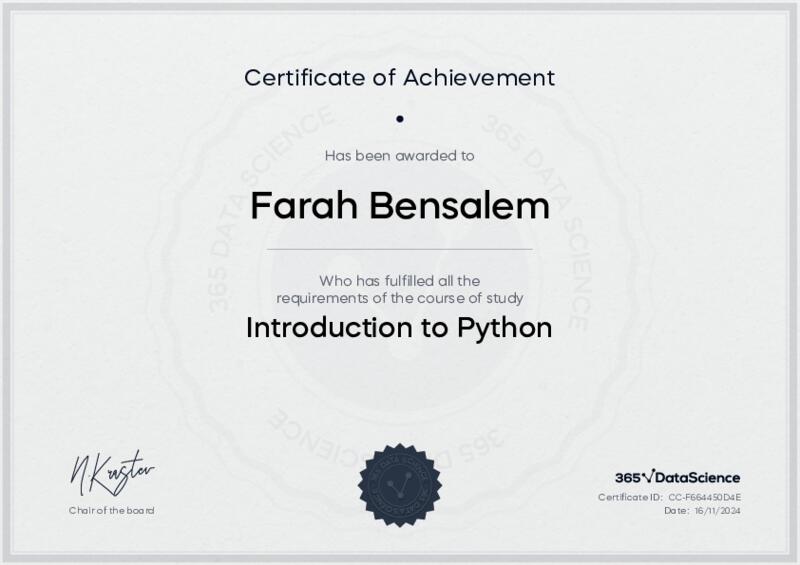 This user has been awarded the Introduction to Python Certificate for successfully completing the course exam. Holding this certificate demonstrates their proficiency on the topic and signifies they are qualified to apply their newly acquired expertise in the fields of data analytics and data science.