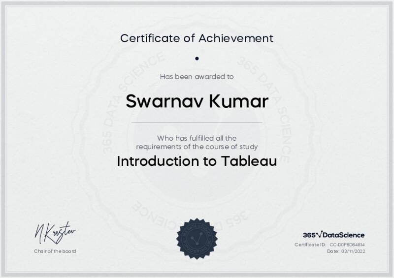This user has been awarded the Introduction to Tableau Certificate for successfully completing the course exam. Holding this certificate demonstrates their proficiency on the topic and signifies they are qualified to apply their newly acquired expertise in the fields of data analytics and data science.