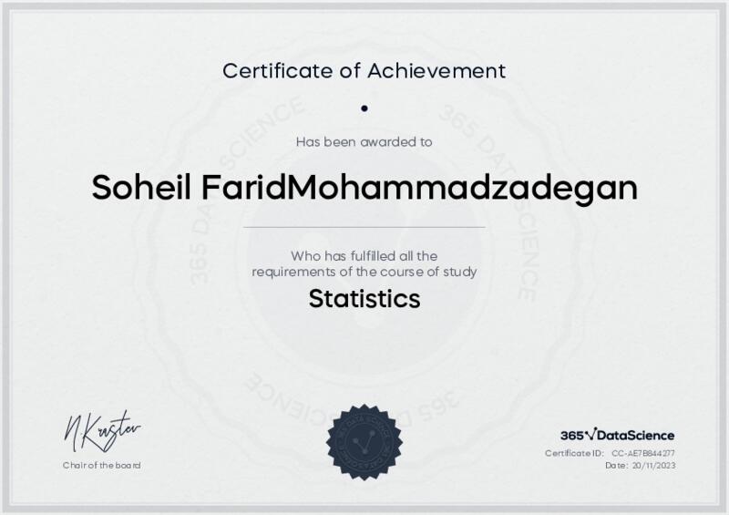 This user has been awarded the Statistics Certificate for successfully completing the course exam. Holding this certificate demonstrates their proficiency on the topic and signifies they are qualified to apply their newly acquired expertise in the fields of data analytics and data science.