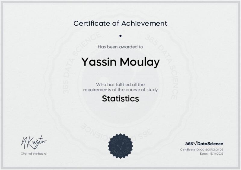 This user has been awarded the Statistics Certificate for successfully completing the course exam. Holding this certificate demonstrates their proficiency on the topic and signifies they are qualified to apply their newly acquired expertise in the fields of data analytics and data science.