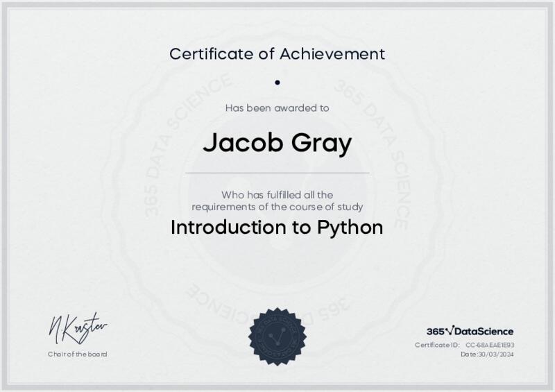 This user has been awarded the Introduction to Python Certificate for successfully completing the course exam. Holding this certificate demonstrates their proficiency on the topic and signifies they are qualified to apply their newly acquired expertise in the fields of data analytics and data science.