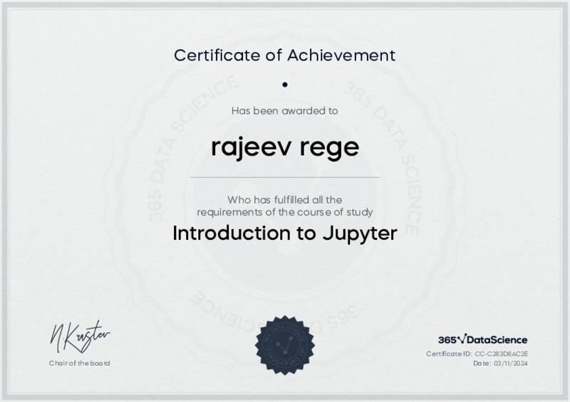 This user has been awarded the Introduction to Jupyter Certificate for successfully completing the course exam. Holding this certificate demonstrates their proficiency on the topic and signifies they are qualified to apply their newly acquired expertise in the fields of data analytics and data science.