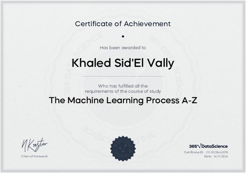 This user has been awarded the The Machine Learning Process A-Z Certificate for successfully completing the course exam. Holding this certificate demonstrates their proficiency on the topic and signifies they are qualified to apply their newly acquired expertise in the fields of data analytics and data science.