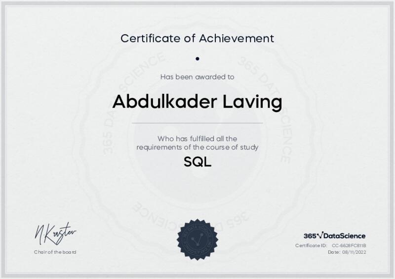 This user has been awarded the SQL Certificate for successfully completing the course exam. Holding this certificate demonstrates their proficiency on the topic and signifies they are qualified to apply their newly acquired expertise in the fields of data analytics and data science.