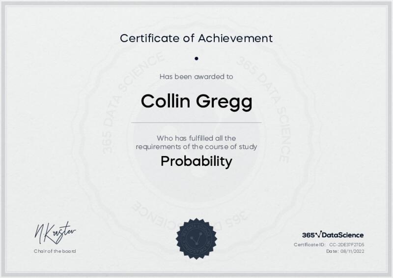 This user has been awarded the Probability Certificate for successfully completing the course exam. Holding this certificate demonstrates their proficiency on the topic and signifies they are qualified to apply their newly acquired expertise in the fields of data analytics and data science.