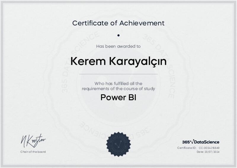 This user has been awarded the Power BI Certificate for successfully completing the course exam. Holding this certificate demonstrates their proficiency on the topic and signifies they are qualified to apply their newly acquired expertise in the fields of data analytics and data science.