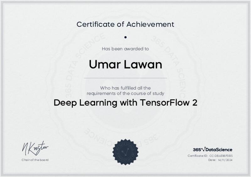 This user has been awarded the Deep Learning with TensorFlow 2 Certificate for successfully completing the course exam. Holding this certificate demonstrates their proficiency on the topic and signifies they are qualified to apply their newly acquired expertise in the fields of data analytics and data science.