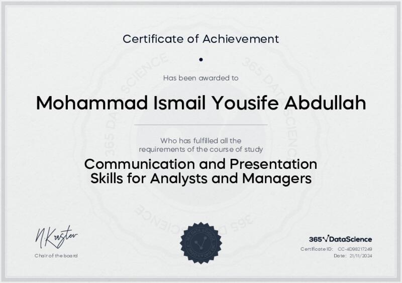 This user has been awarded the Communication and Presentation Skills for Analysts and Managers Certificate for successfully completing the course exam. Holding this certificate demonstrates their proficiency on the topic and signifies they are qualified to apply their newly acquired expertise in the fields of data analytics and data science.