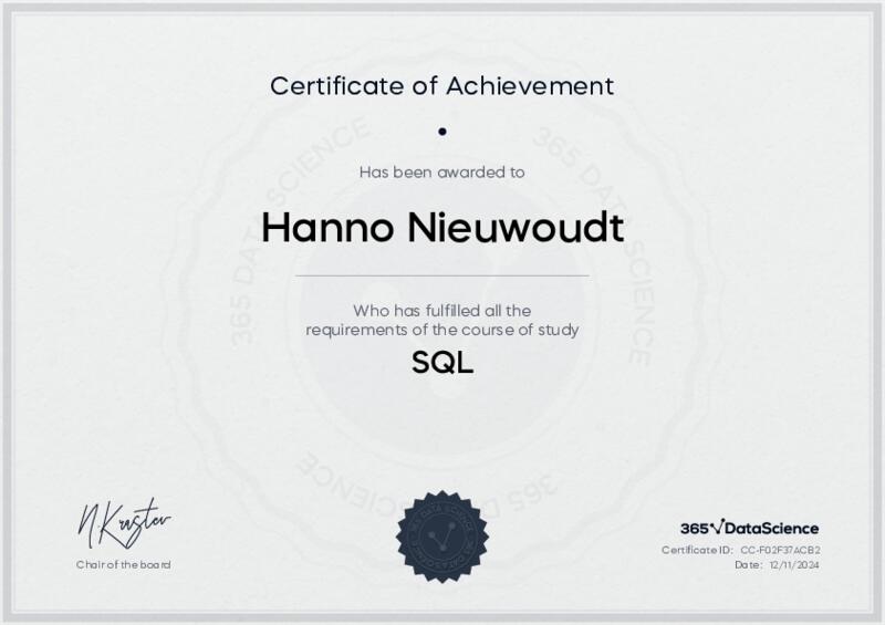 This user has been awarded the SQL Certificate for successfully completing the course exam. Holding this certificate demonstrates their proficiency on the topic and signifies they are qualified to apply their newly acquired expertise in the fields of data analytics and data science.