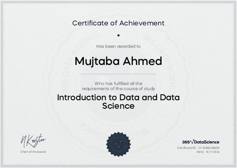 This user has been awarded the Introduction to Data and Data Science Certificate for successfully completing the course exam. Holding this certificate demonstrates their proficiency on the topic and signifies they are qualified to apply their newly acquired expertise in the fields of data analytics and data science.