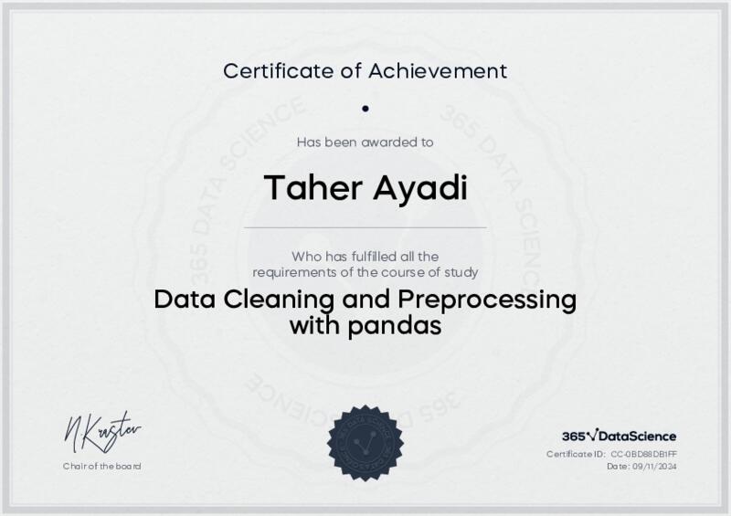 This user has been awarded the Data Cleaning and Preprocessing with pandas Certificate for successfully completing the course exam. Holding this certificate demonstrates their proficiency on the topic and signifies they are qualified to apply their newly acquired expertise in the fields of data analytics and data science.
