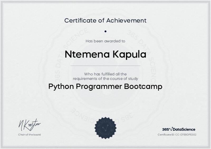 This user has been awarded the Python Programmer Bootcamp Certificate for successfully completing the course exam. Holding this certificate demonstrates their proficiency on the topic and signifies they are qualified to apply their newly acquired expertise in the fields of data analytics and data science.