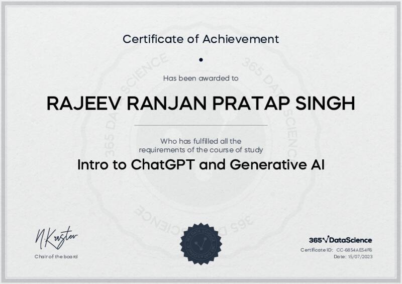 This user has been awarded the Intro to ChatGPT and Generative AI Certificate for successfully completing the course exam. Holding this certificate demonstrates their proficiency on the topic and signifies they are qualified to apply their newly acquired expertise in the fields of data analytics and data science.