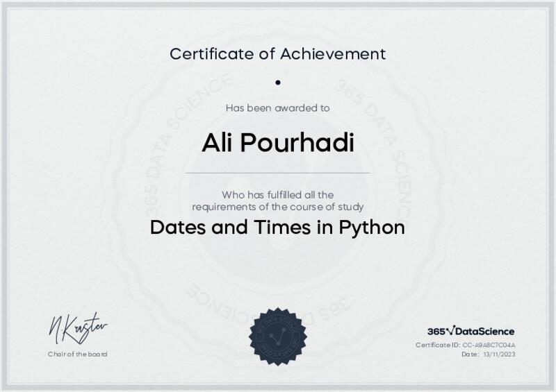 This user has been awarded the Dates and Times in Python Certificate for successfully completing the course exam. Holding this certificate demonstrates their proficiency on the topic and signifies they are qualified to apply their newly acquired expertise in the fields of data analytics and data science.
