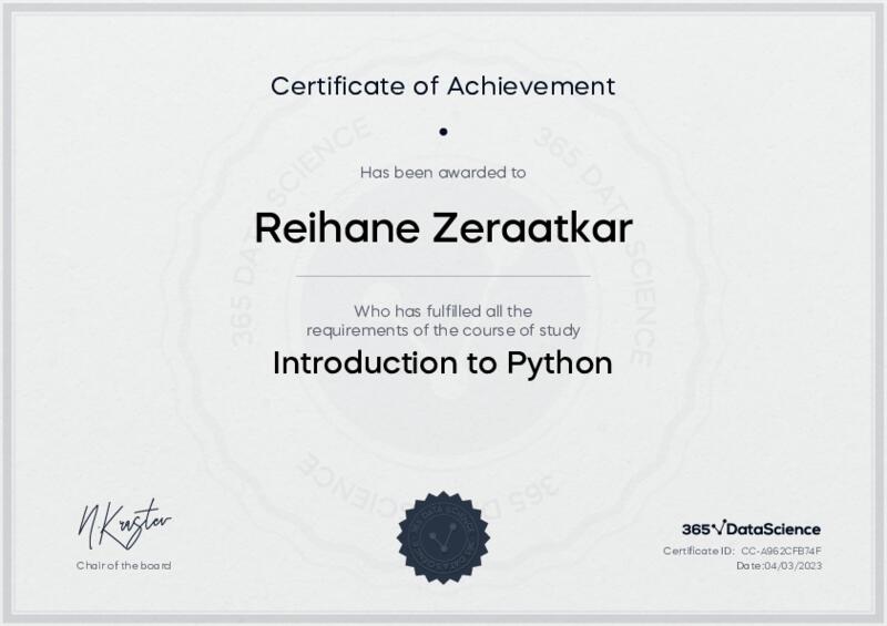 This user has been awarded the Introduction to Python Certificate for successfully completing the course exam. Holding this certificate demonstrates their proficiency on the topic and signifies they are qualified to apply their newly acquired expertise in the fields of data analytics and data science.