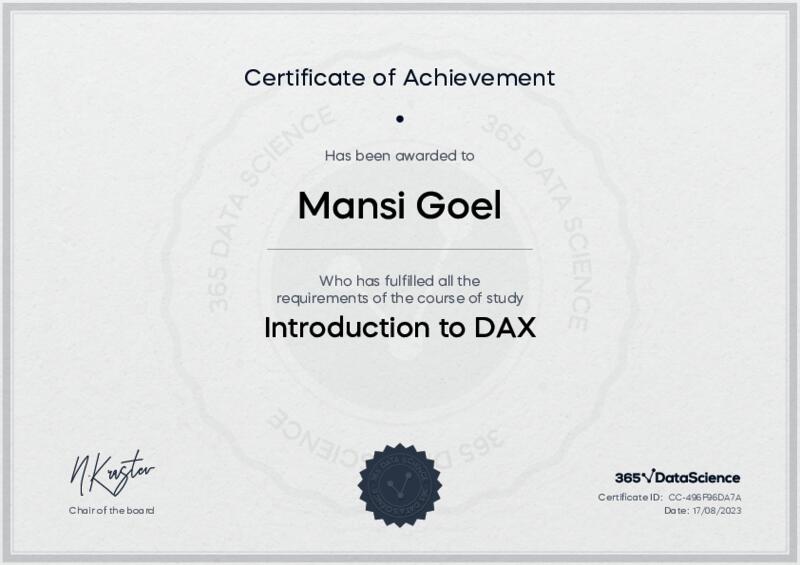 This user has been awarded the Introduction to DAX Certificate for successfully completing the course exam. Holding this certificate demonstrates their proficiency on the topic and signifies they are qualified to apply their newly acquired expertise in the fields of data analytics and data science.