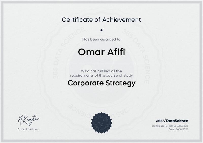 This user has been awarded the Corporate Strategy Certificate for successfully completing the course exam. Holding this certificate demonstrates their proficiency on the topic and signifies they are qualified to apply their newly acquired expertise in the fields of data analytics and data science.