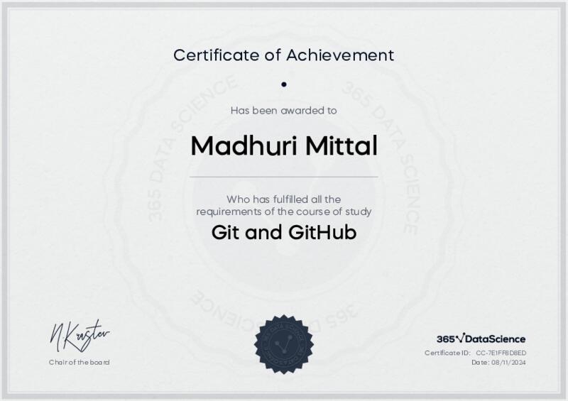 This user has been awarded the Git and GitHub Certificate for successfully completing the course exam. Holding this certificate demonstrates their proficiency on the topic and signifies they are qualified to apply their newly acquired expertise in the fields of data analytics and data science.