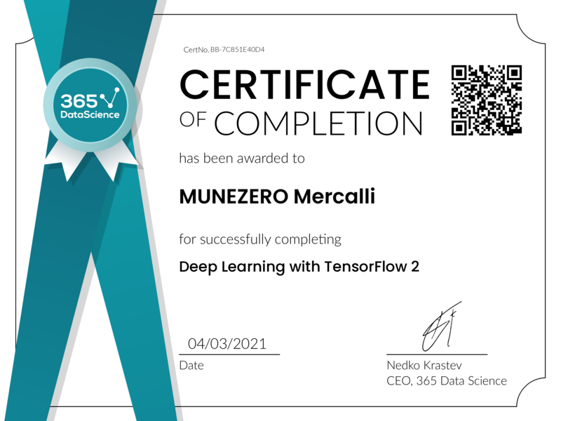Congratulations! You have been awarded the 365 Data Science Certificate for successfully completing this course. Holding this certificate demonstrates your proficiency on the topic and your ability to apply your newly acquired expertise in the fields of data analytics and data science with confidence.