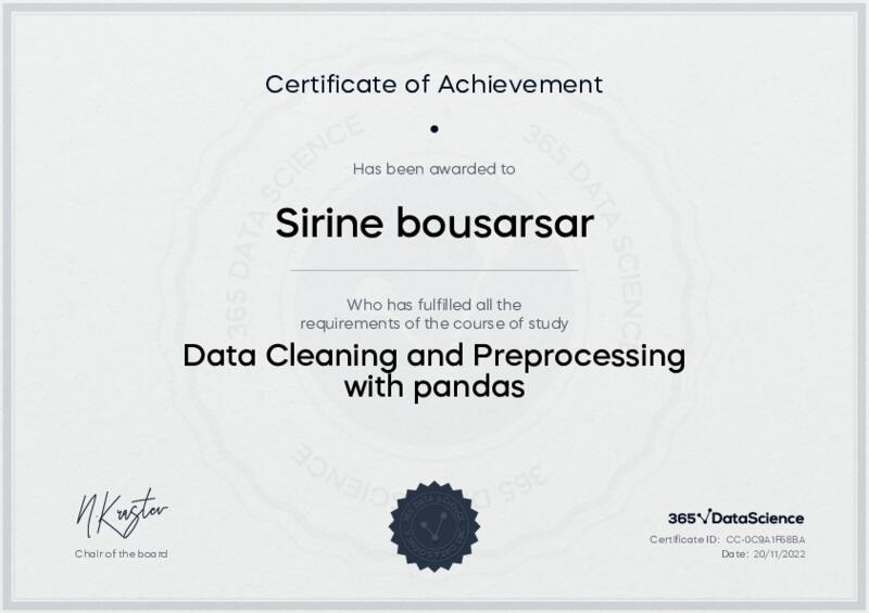 This user has been awarded the Data Cleaning and Preprocessing with pandas Certificate for successfully completing the course exam. Holding this certificate demonstrates their proficiency on the topic and signifies they are qualified to apply their newly acquired expertise in the fields of data analytics and data science.