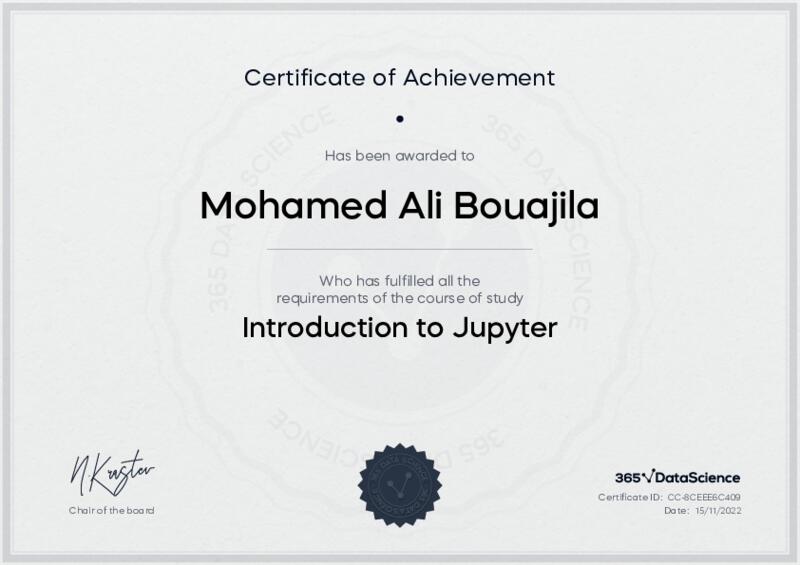 This user has been awarded the Introduction to Jupyter Certificate for successfully completing the course exam. Holding this certificate demonstrates their proficiency on the topic and signifies they are qualified to apply their newly acquired expertise in the fields of data analytics and data science.