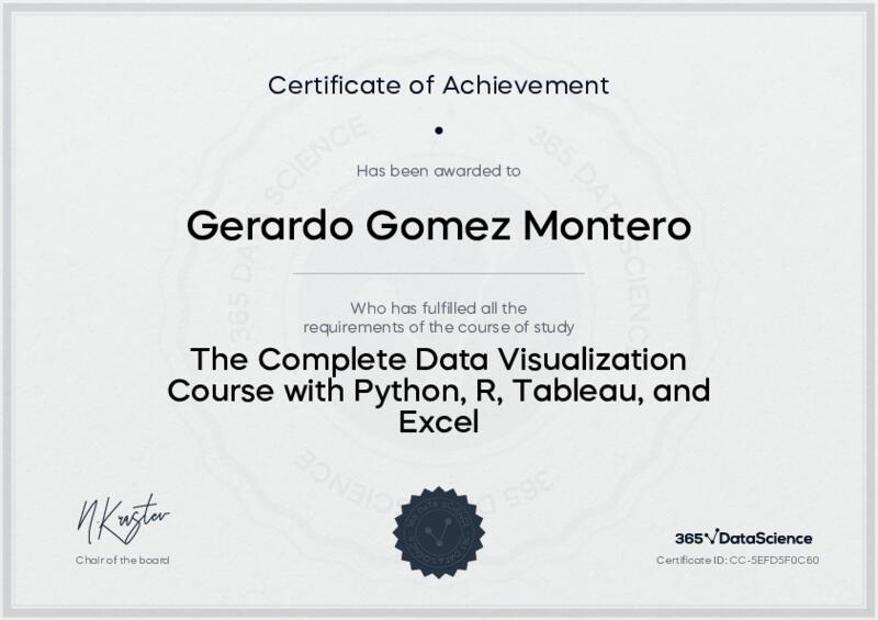 This user has been awarded the The Complete Data Visualization Course with Python, R, Tableau, and Excel Certificate for successfully completing the course exam. Holding this certificate demonstrates their proficiency on the topic and signifies they are qualified to apply their newly acquired expertise in the fields of data analytics and data science.