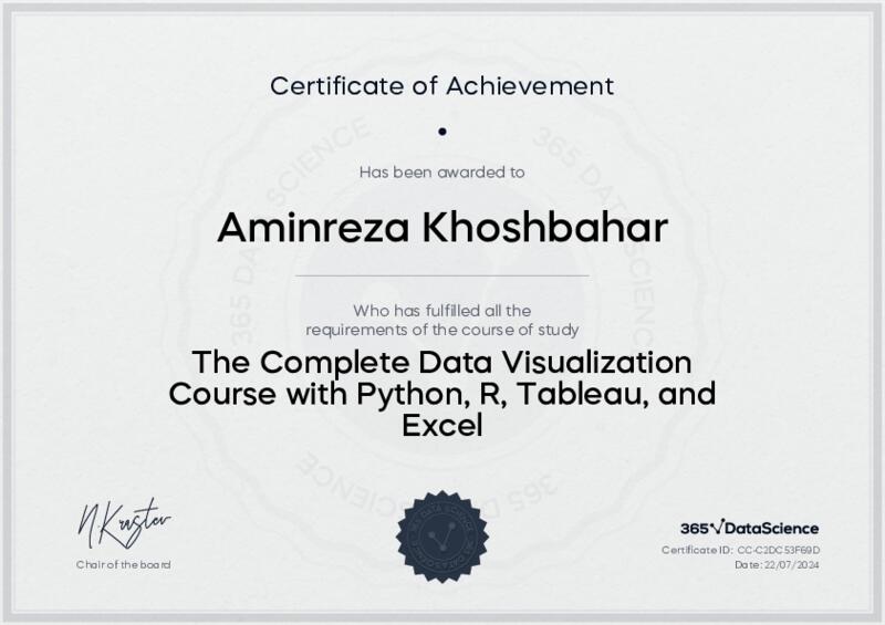 This user has been awarded the The Complete Data Visualization Course with Python, R, Tableau, and Excel Certificate for successfully completing the course exam. Holding this certificate demonstrates their proficiency on the topic and signifies they are qualified to apply their newly acquired expertise in the fields of data analytics and data science.