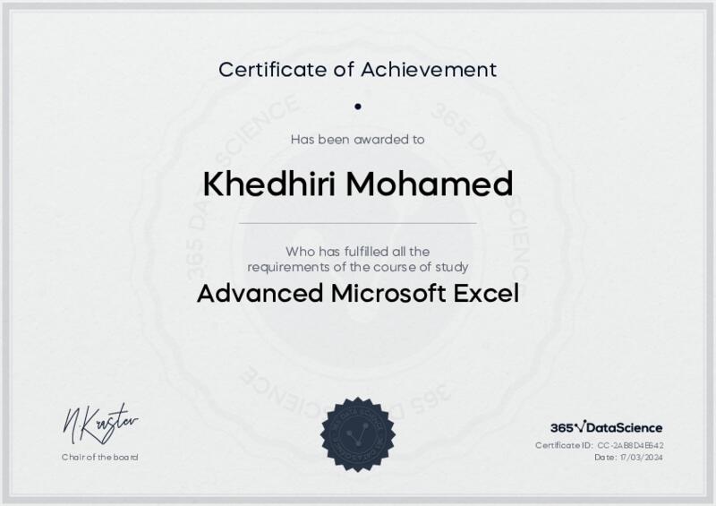 This user has been awarded the Advanced Microsoft Excel Certificate for successfully completing the course exam. Holding this certificate demonstrates their proficiency on the topic and signifies they are qualified to apply their newly acquired expertise in the fields of data analytics and data science.