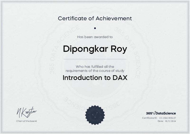 This user has been awarded the Introduction to DAX Certificate for successfully completing the course exam. Holding this certificate demonstrates their proficiency on the topic and signifies they are qualified to apply their newly acquired expertise in the fields of data analytics and data science.