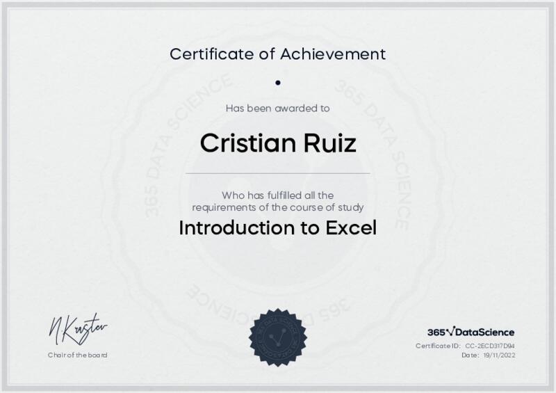 This user has been awarded the Introduction to Excel Certificate for successfully completing the course exam. Holding this certificate demonstrates their proficiency on the topic and signifies they are qualified to apply their newly acquired expertise in the fields of data analytics and data science.