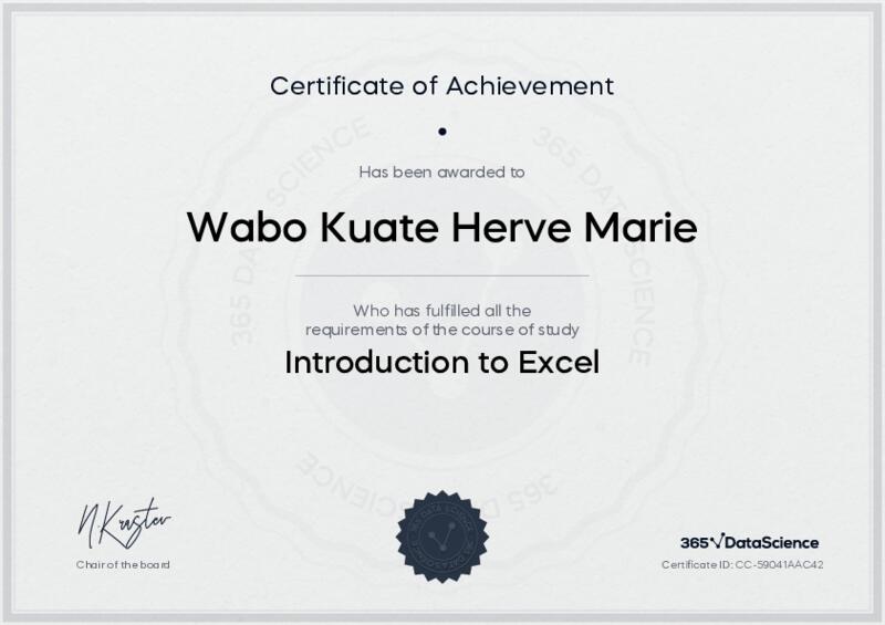 This user has been awarded the Introduction to Excel Certificate for successfully completing the course exam. Holding this certificate demonstrates their proficiency on the topic and signifies they are qualified to apply their newly acquired expertise in the fields of data analytics and data science.