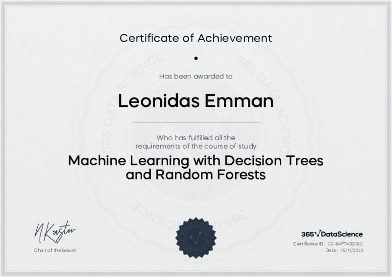 This user has been awarded the Machine Learning with Decision Trees and Random Forests Certificate for successfully completing the course exam. Holding this certificate demonstrates their proficiency on the topic and signifies they are qualified to apply their newly acquired expertise in the fields of data analytics and data science.