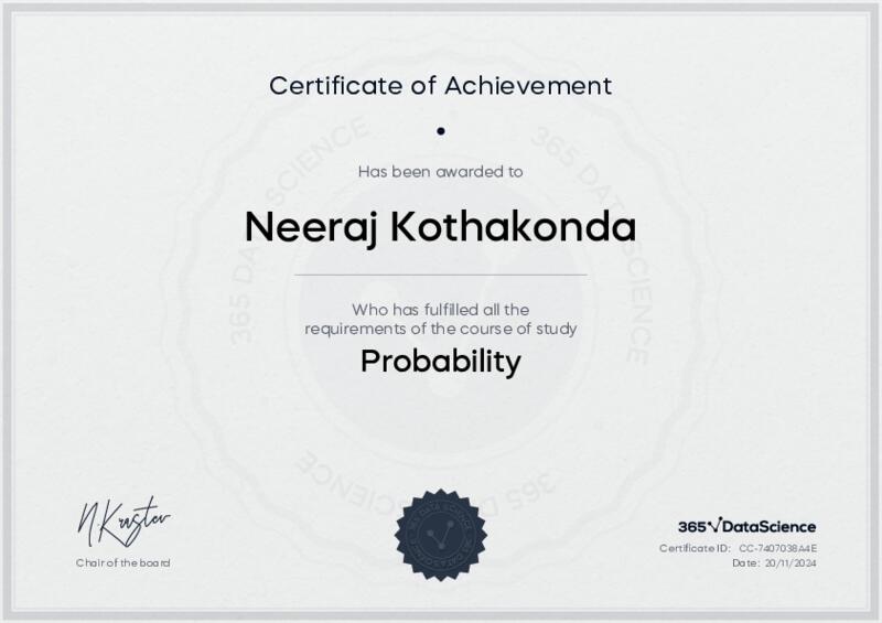 This user has been awarded the Probability Certificate for successfully completing the course exam. Holding this certificate demonstrates their proficiency on the topic and signifies they are qualified to apply their newly acquired expertise in the fields of data analytics and data science.