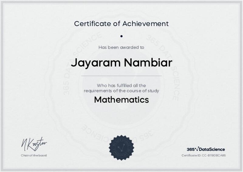 This user has been awarded the Mathematics Certificate for successfully completing the course exam. Holding this certificate demonstrates their proficiency on the topic and signifies they are qualified to apply their newly acquired expertise in the fields of data analytics and data science.