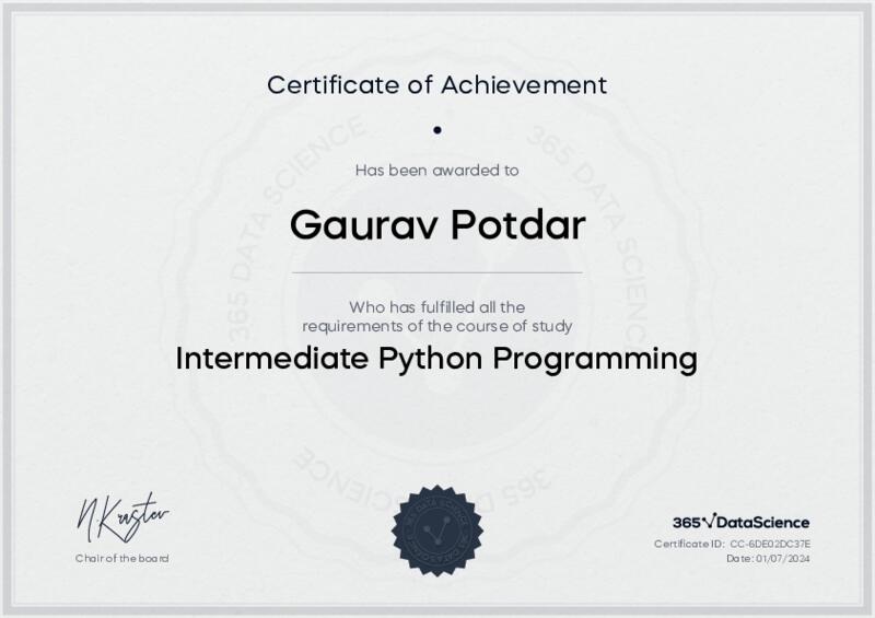 This user has been awarded the Intermediate Python Programming Certificate for successfully completing the course exam. Holding this certificate demonstrates their proficiency on the topic and signifies they are qualified to apply their newly acquired expertise in the fields of data analytics and data science.