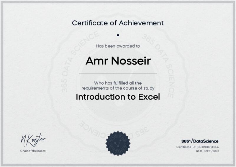This user has been awarded the Introduction to Excel Certificate for successfully completing the course exam. Holding this certificate demonstrates their proficiency on the topic and signifies they are qualified to apply their newly acquired expertise in the fields of data analytics and data science.