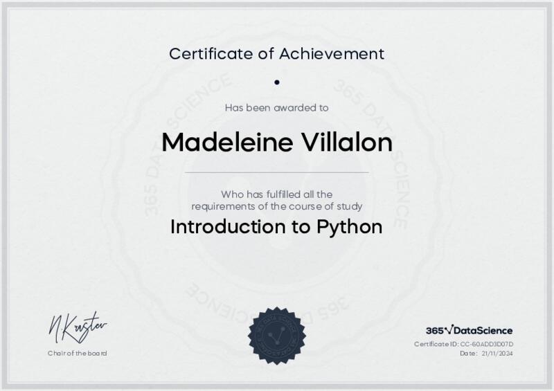 This user has been awarded the Introduction to Python Certificate for successfully completing the course exam. Holding this certificate demonstrates their proficiency on the topic and signifies they are qualified to apply their newly acquired expertise in the fields of data analytics and data science.