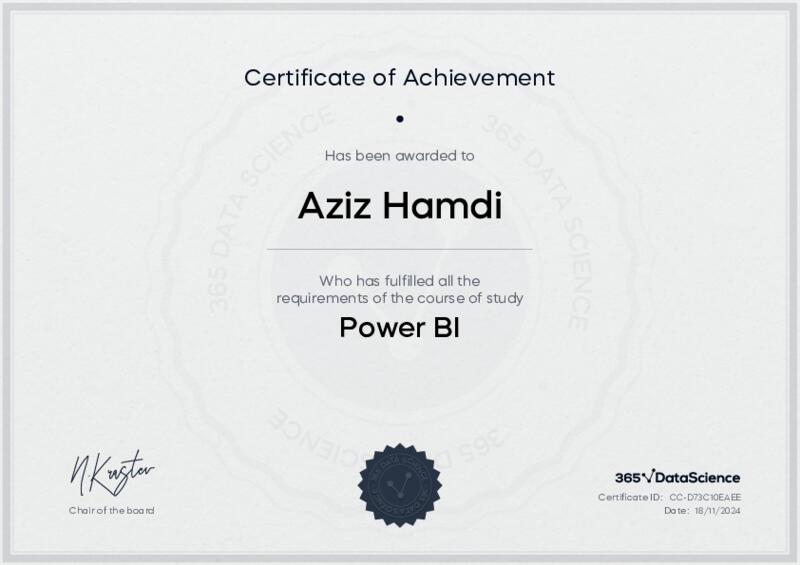 This user has been awarded the Power BI Certificate for successfully completing the course exam. Holding this certificate demonstrates their proficiency on the topic and signifies they are qualified to apply their newly acquired expertise in the fields of data analytics and data science.