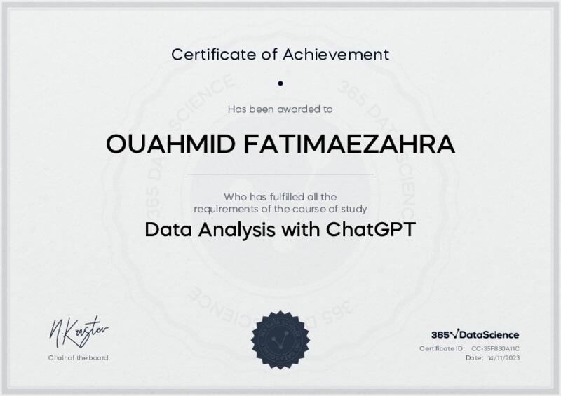 This user has been awarded the Data Analysis with ChatGPT Certificate for successfully completing the course exam. Holding this certificate demonstrates their proficiency on the topic and signifies they are qualified to apply their newly acquired expertise in the fields of data analytics and data science.
