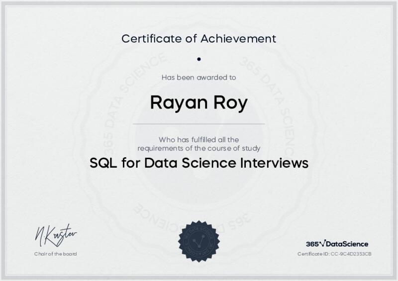This user has been awarded the SQL for Data Science Interviews Certificate for successfully completing the course exam. Holding this certificate demonstrates their proficiency on the topic and signifies they are qualified to apply their newly acquired expertise in the fields of data analytics and data science.