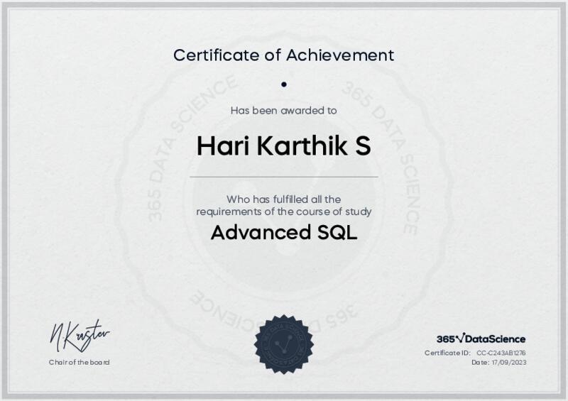 This user has been awarded the Advanced SQL Certificate for successfully completing the course exam. Holding this certificate demonstrates their proficiency on the topic and signifies they are qualified to apply their newly acquired expertise in the fields of data analytics and data science.