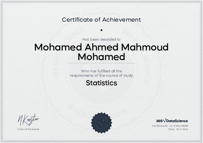 This user has been awarded the Statistics Certificate for successfully completing the course exam. Holding this certificate demonstrates their proficiency on the topic and signifies they are qualified to apply their newly acquired expertise in the fields of data analytics and data science.