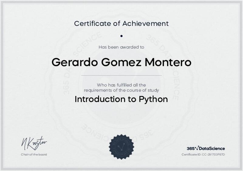 This user has been awarded the Introduction to Python Certificate for successfully completing the course exam. Holding this certificate demonstrates their proficiency on the topic and signifies they are qualified to apply their newly acquired expertise in the fields of data analytics and data science.