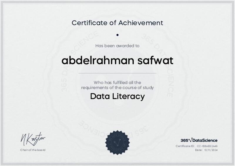 This user has been awarded the Data Literacy Certificate for successfully completing the course exam. Holding this certificate demonstrates their proficiency on the topic and signifies they are qualified to apply their newly acquired expertise in the fields of data analytics and data science.
