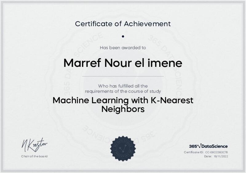This user has been awarded the Machine Learning with K-Nearest Neighbors Certificate for successfully completing the course exam. Holding this certificate demonstrates their proficiency on the topic and signifies they are qualified to apply their newly acquired expertise in the fields of data analytics and data science.