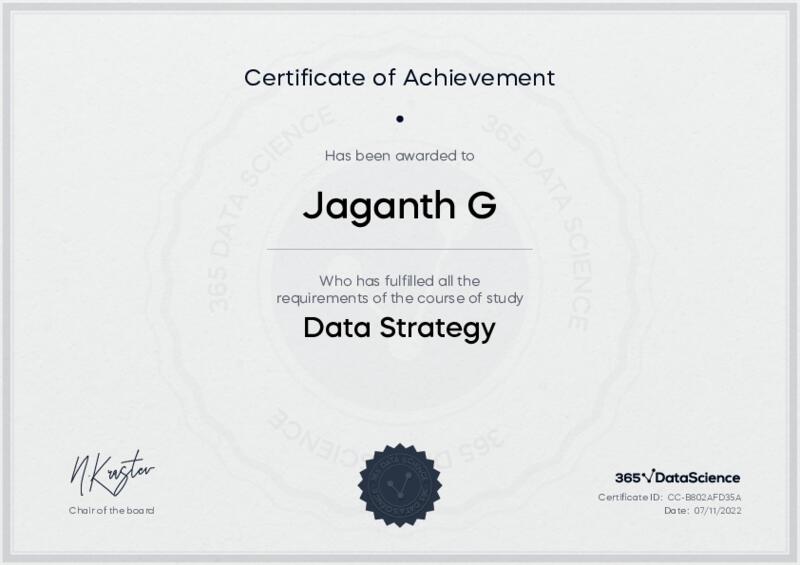 This user has been awarded the Data Strategy Certificate for successfully completing the course exam. Holding this certificate demonstrates their proficiency on the topic and signifies they are qualified to apply their newly acquired expertise in the fields of data analytics and data science.