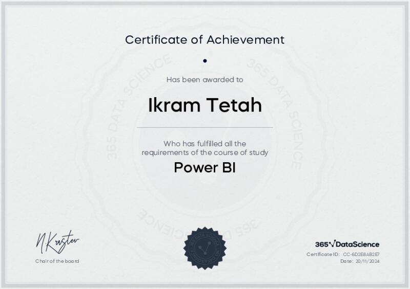 This user has been awarded the Power BI Certificate for successfully completing the course exam. Holding this certificate demonstrates their proficiency on the topic and signifies they are qualified to apply their newly acquired expertise in the fields of data analytics and data science.