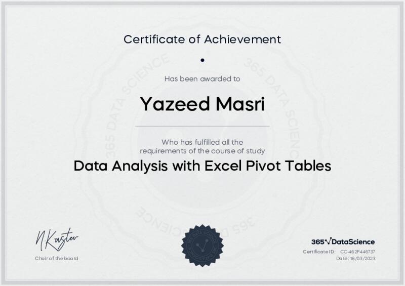 This user has been awarded the Data Analysis with Excel Pivot Tables Certificate for successfully completing the course exam. Holding this certificate demonstrates their proficiency on the topic and signifies they are qualified to apply their newly acquired expertise in the fields of data analytics and data science.